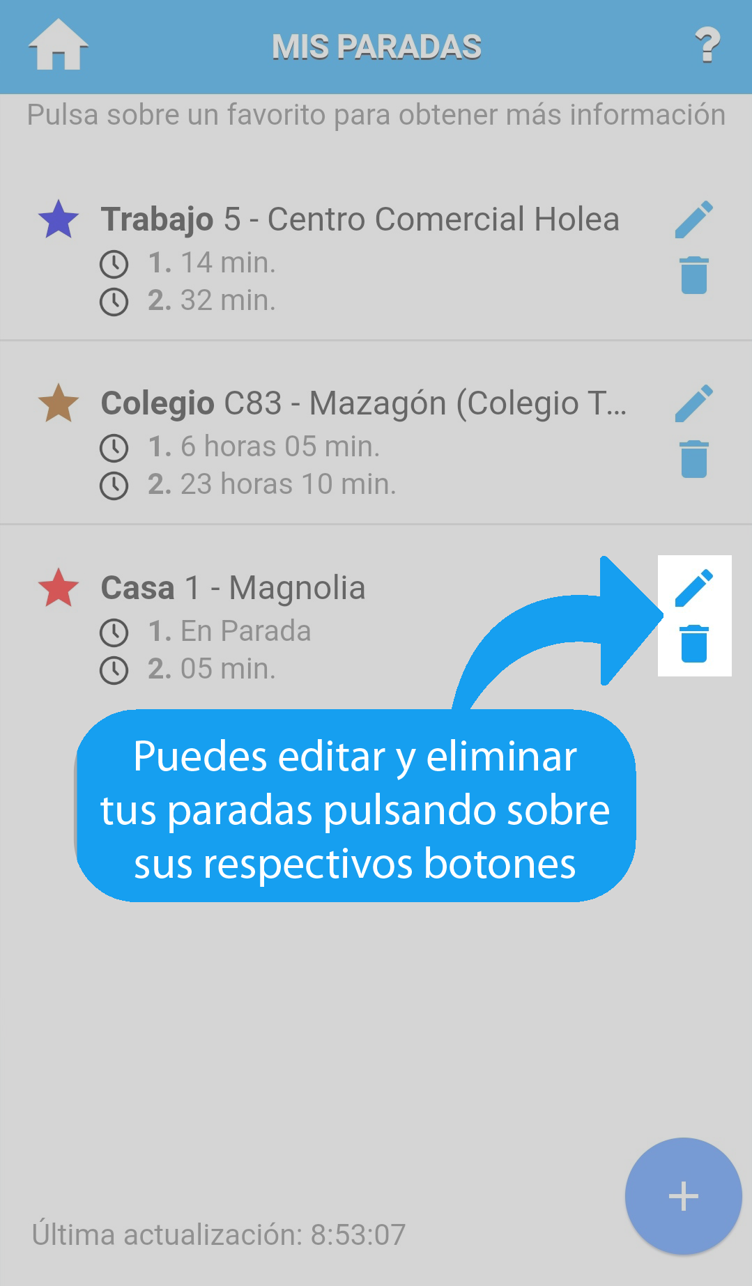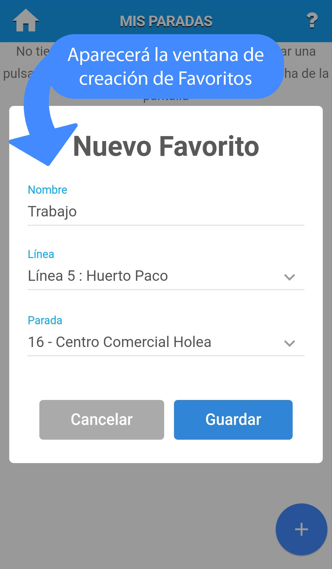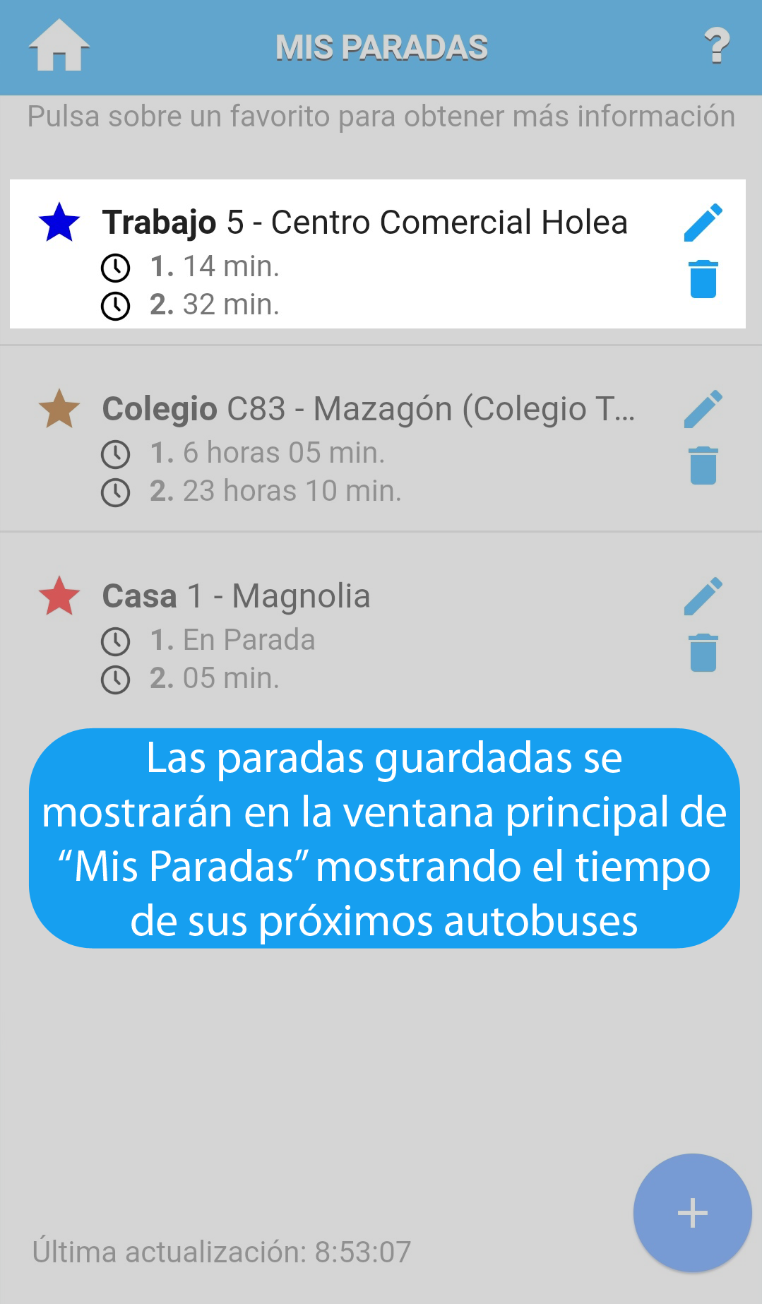 Permite crear, editar y ver paradas guardadas como favoritas.