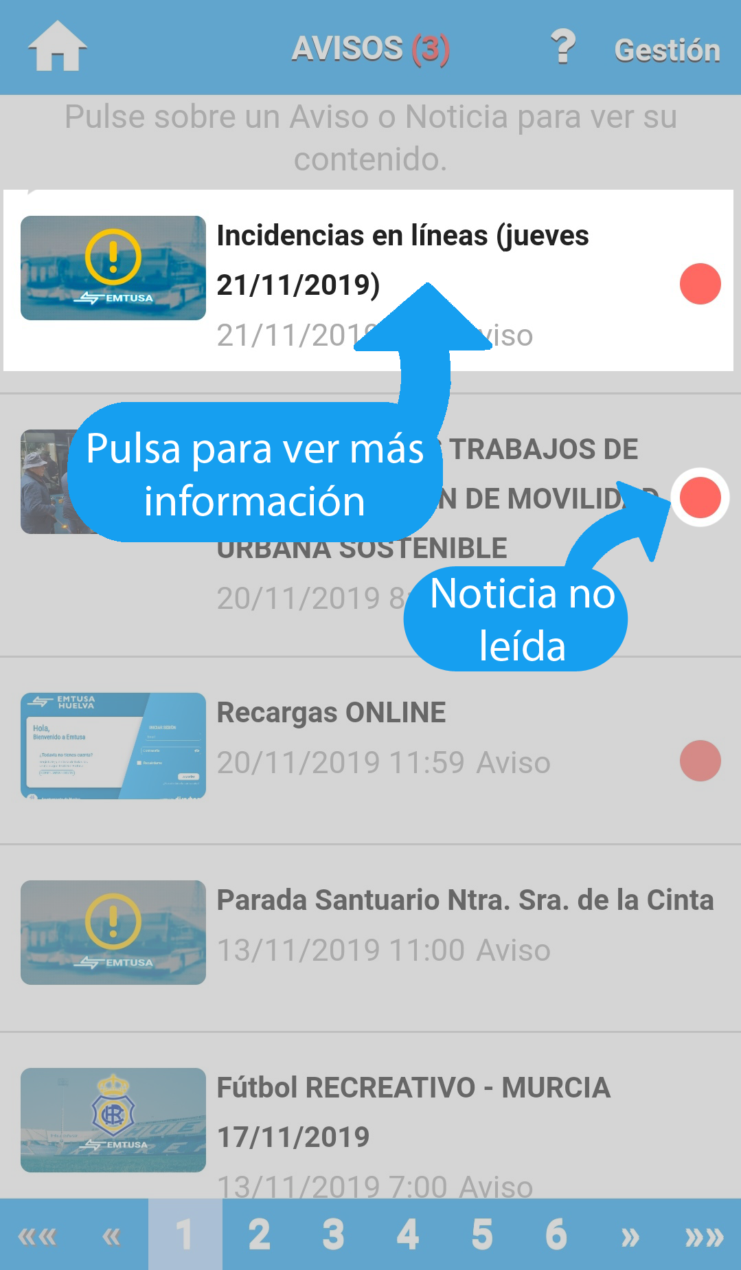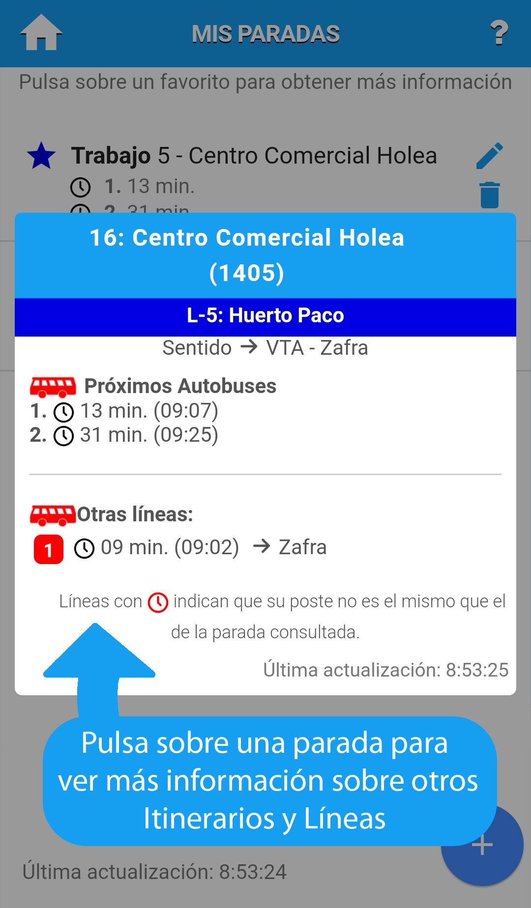 Muestra las paradas de las lineas y los tiempos de llegada de los autobuses.